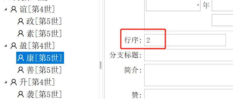 4.增加“行序管理”功能,主要用于“行序版”,可以调整族内兄弟排行(同代人排列顺序)